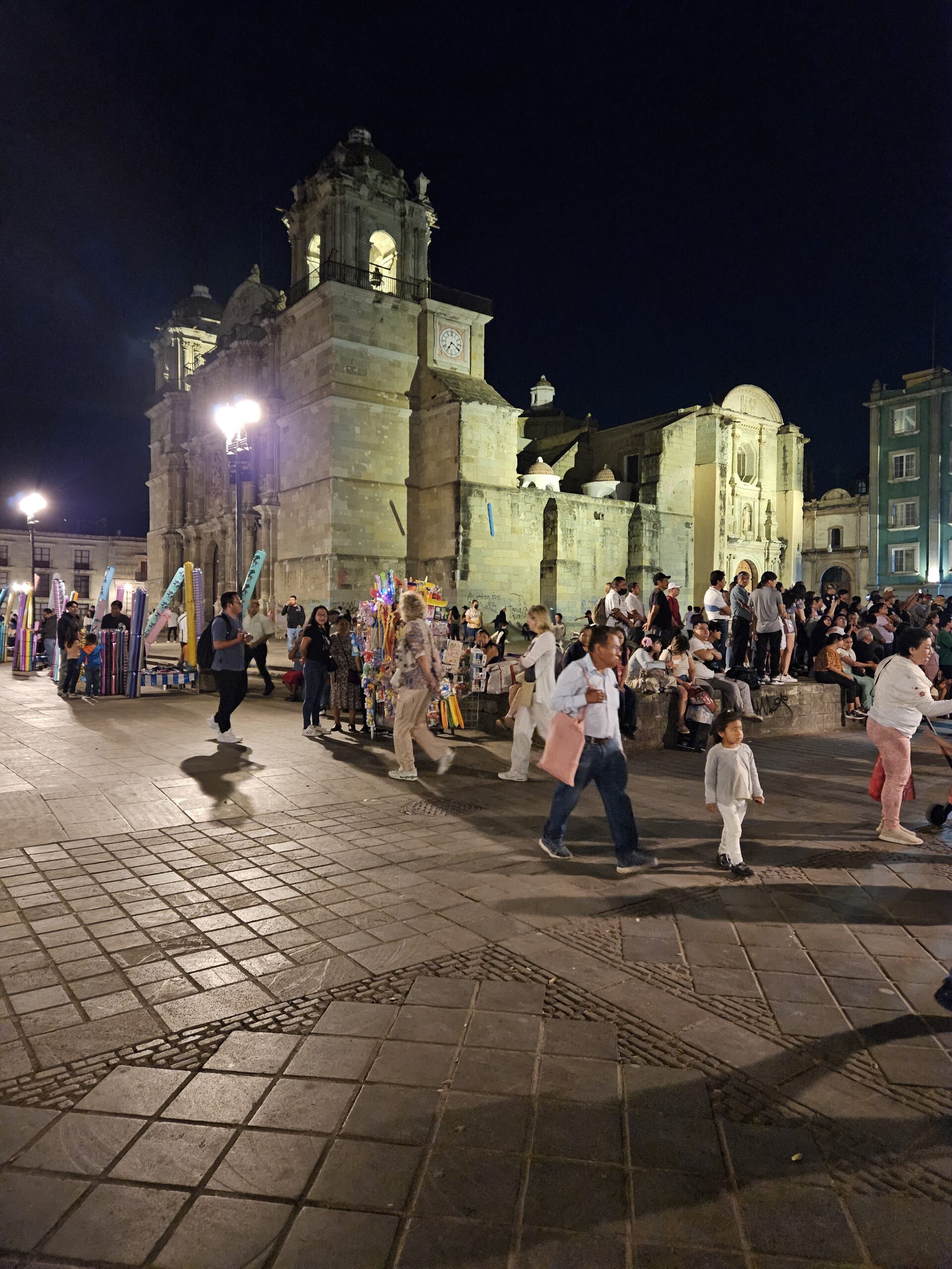 The square is full of activity; vendors selling balloons, fresh fruit snacks, ice cream, and souvenirs, families out for a stroll, and shoe shine stations are all part of the normal part of life in Oaxaca.